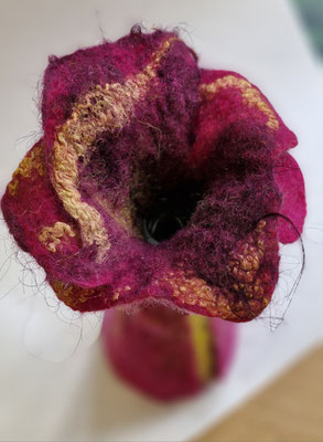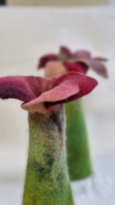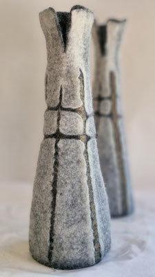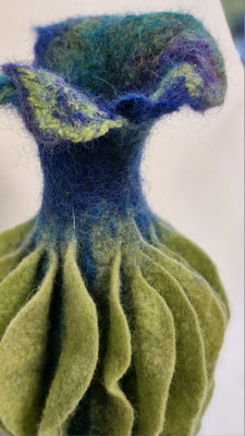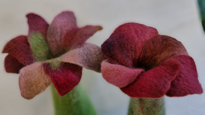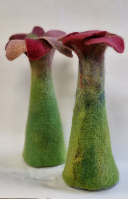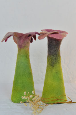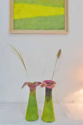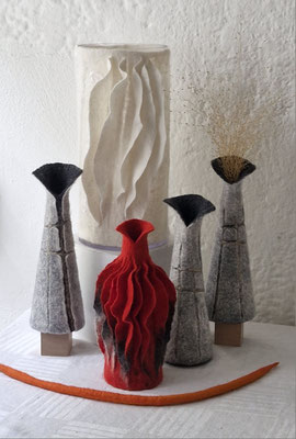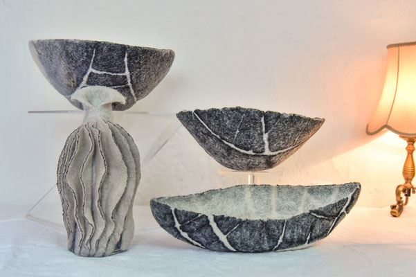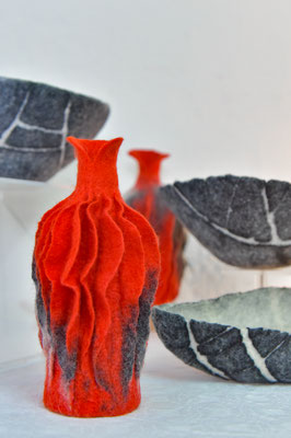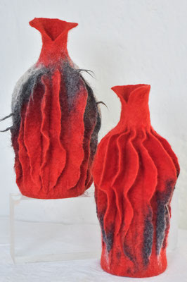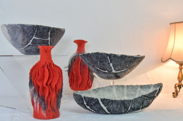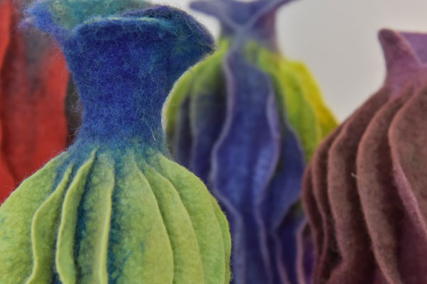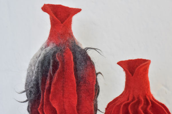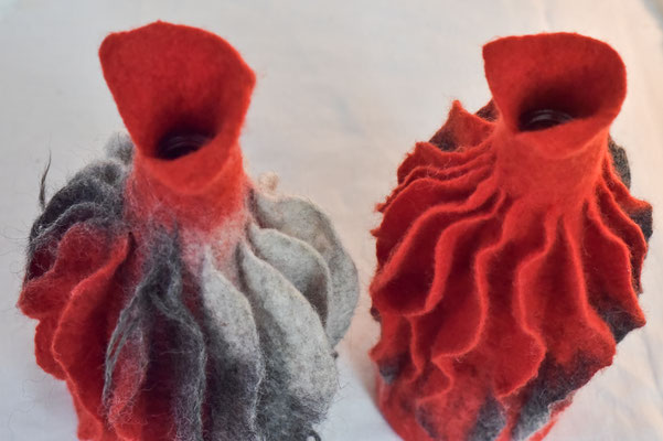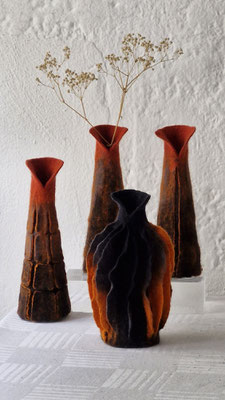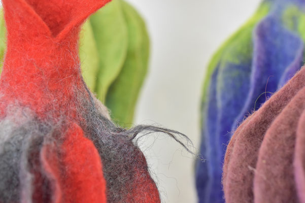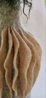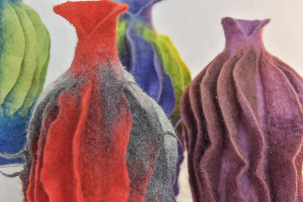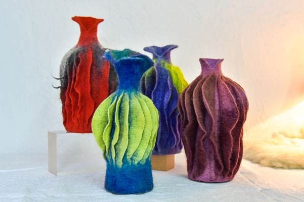 Sie sind ergänzend und immer leicht, aus feinster handgefärbter Merino, Seide und anderen Fasern aufwändig und als Einzelstücke per Hand hergestellt.